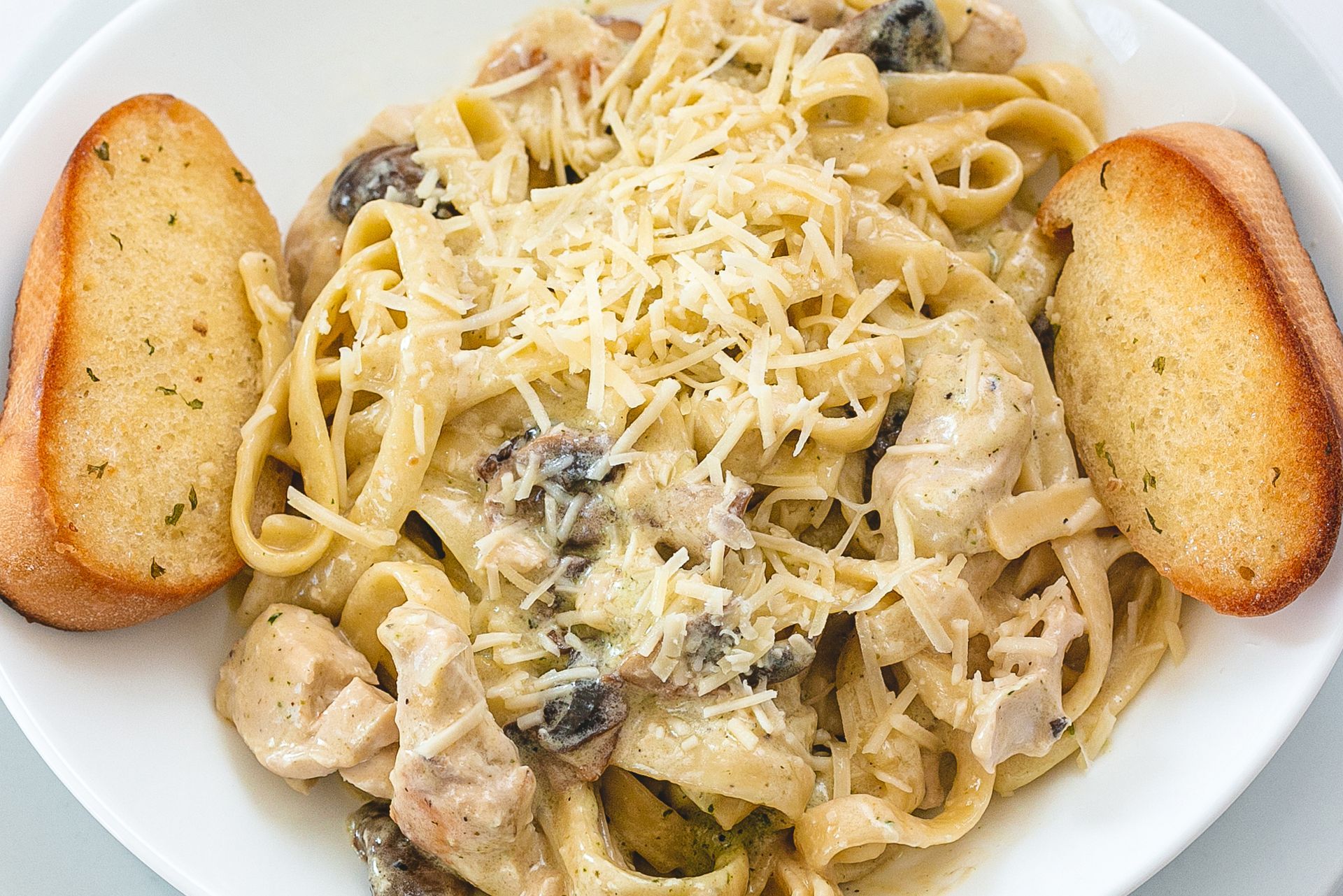 Sautéed chicken, mushrooms, and garlic tossed with fettuccine pasta and smothered with our homemade creamy basil and parmesan cheese sauce and served with garlic toast.