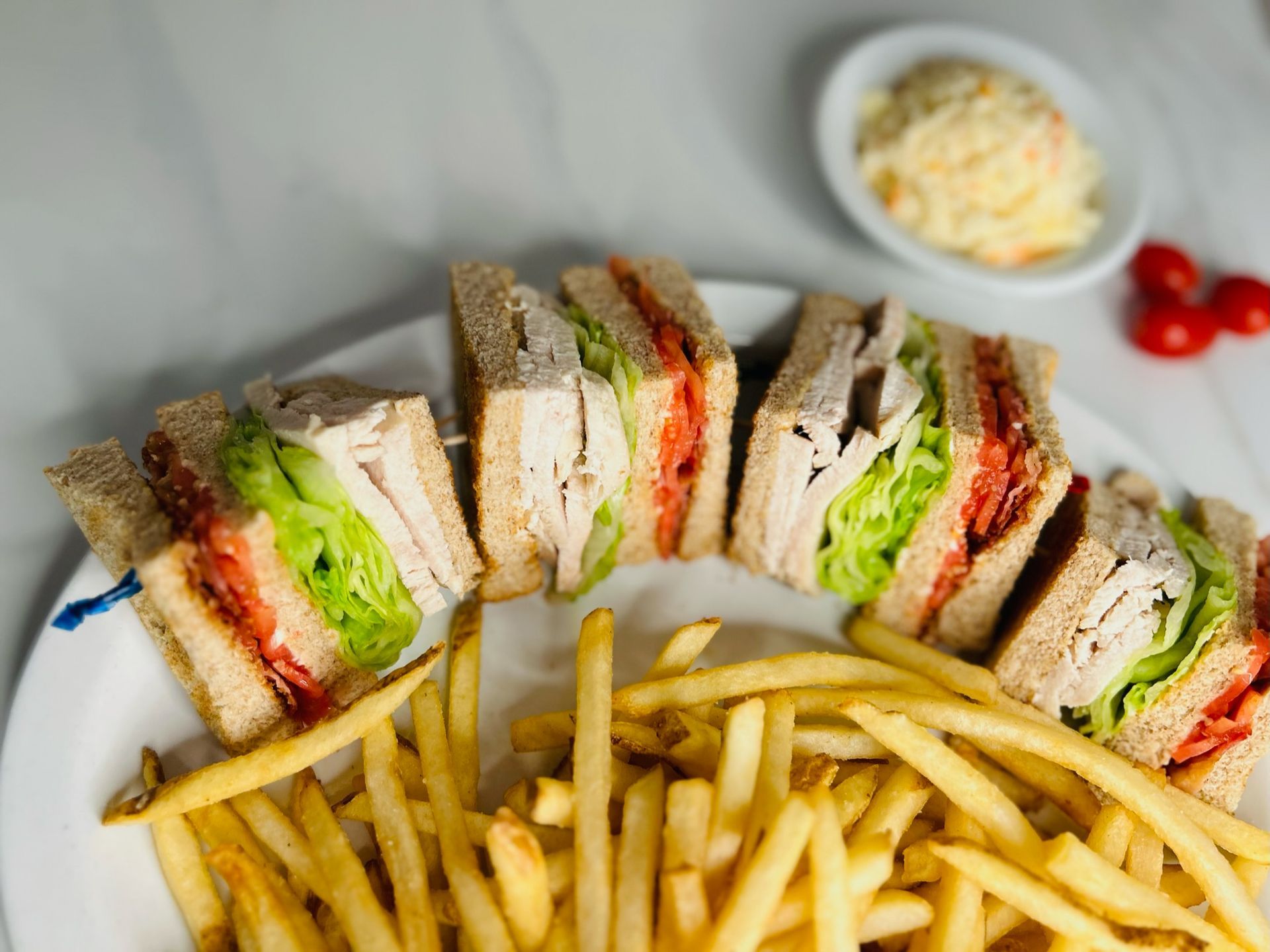 A traditional 3 layer toasted sandwich with chicken, lettuce, tomato, bacon and mayo. Served with fries.