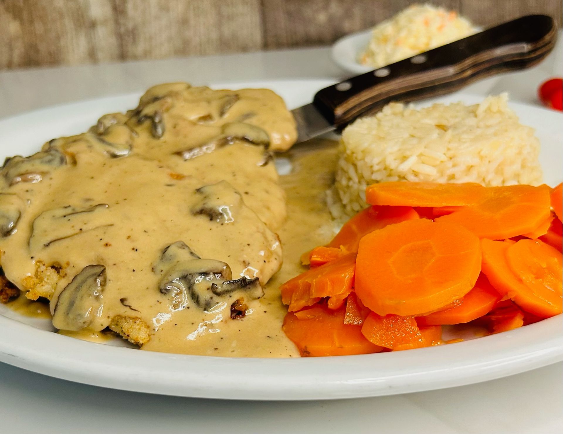 Hand breaded pork schnitzel in our own garlic mushroom sauce, served with choice of potato and veggies.